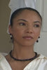 A series of black onyx beads connect to a sterling silver chain. This necklace is designed to sit above the collarbone.